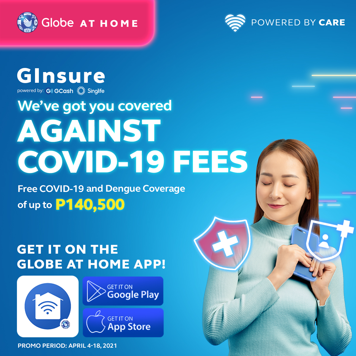 Postpaid subscribers of Globe At Home should mark their calendars because starting April 4, 2021 until April 18, 2021, they can claim their FREE COVID-19 and Dengue Insurance for 3 months powered by GInsure and Singlife with coverage of up to P140,500.