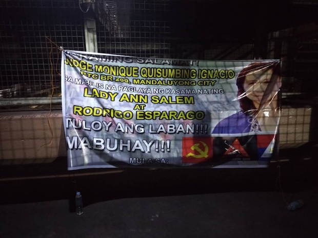 The red-tagging came in the form of a tarpaulin sign at the corner of Shaw Boulevard and EDSA that says: “Maraming salamat Judge Monique Quisumbing-Ignacio, RTC Branch 209, Mandaluyong City sa mabilis na paglaya ng kasamahan nating Lady Ann Salem at Rodrigo Esparago. Tuloy ang laban! Mabuhay!”